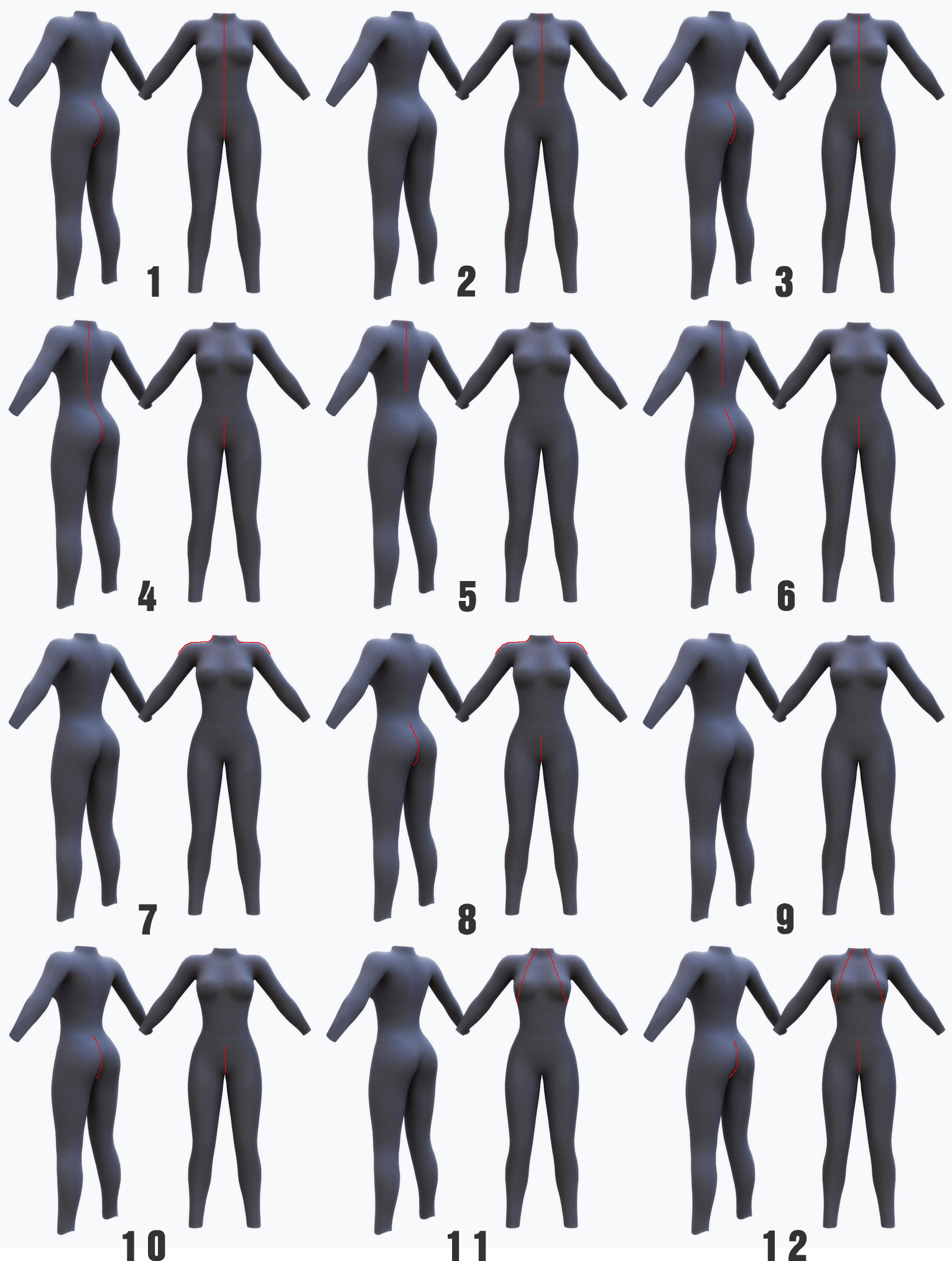 11. Two front diagonal neck-to-side-waist zips and no crotch zipper;